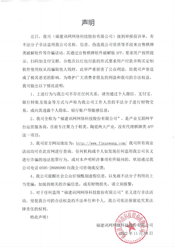 近日,我司(福建訊網網絡科技股份有限公司)接到舉報投訴單,有不法分子非法盜用我公司名稱、信息,偽造我公司資質等手段來出售棋牌類破解軟件等詐騙活動。其通過出售棋牌軟件破解版APP,要求用戶按照提示,掃碼加支付寶群,分批次以紅包付款的形式要求用戶付款并購買定制軟件使用權從而騙取他人錢財,此舉嚴重損害了公眾利益,給我司聲譽造成了極其惡劣的影響,為維護廣大消費者朋友的利益和我司的合法權益,我司做出以下情況說明: