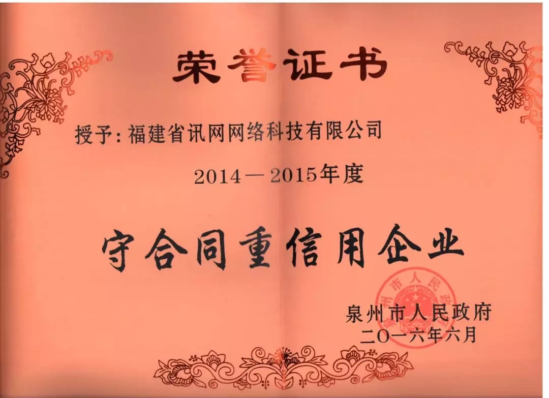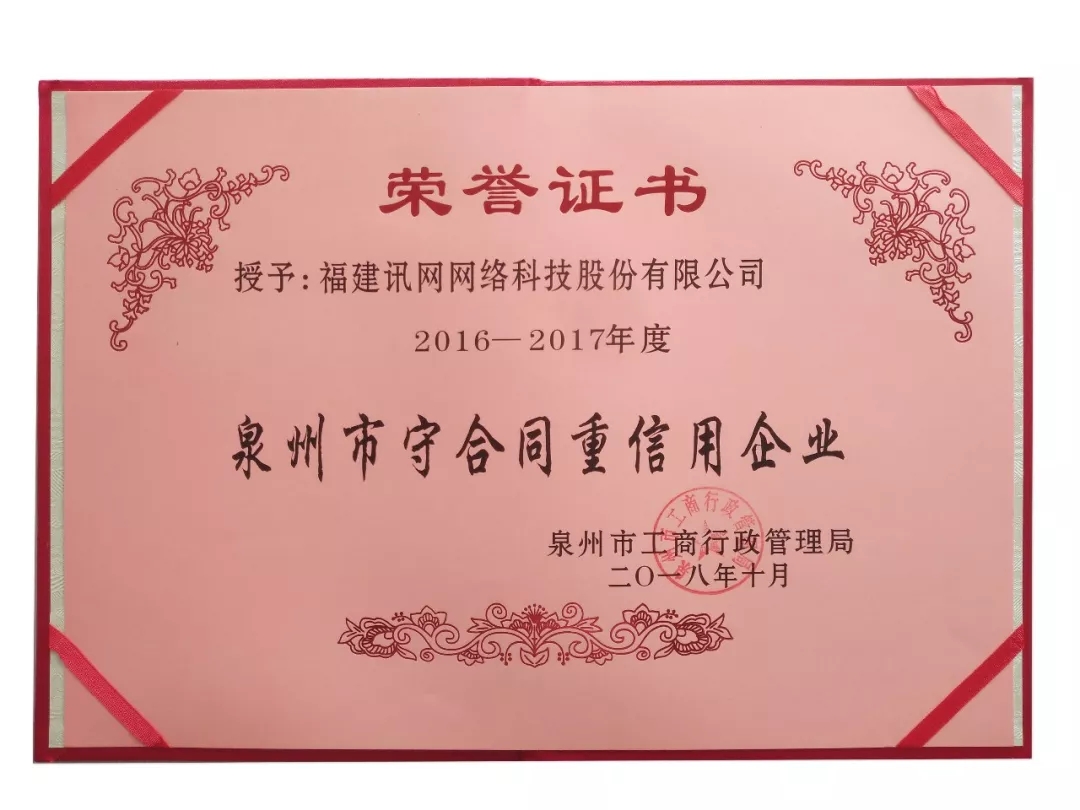 日前,2016-2017年度泉州市守合同重信用企業(yè)名單正式揭曉,福建訊網(wǎng)網(wǎng)絡(luò)科技股份有限公司(簡稱“訊網(wǎng)網(wǎng)絡(luò)”)蟬聯(lián)泉州市守合同重信用企業(yè)。